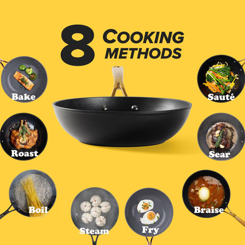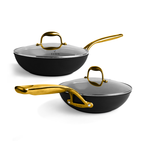 The Frök 2-pack replaces the need to buy 16 different pans or large cookware sets! With high-sloped walls, a large flat base, and a 3.6 qt capacity, you'll be able to bake, boil, braise, roast, fry, sear, steam, and sauté twice as much in half the time!